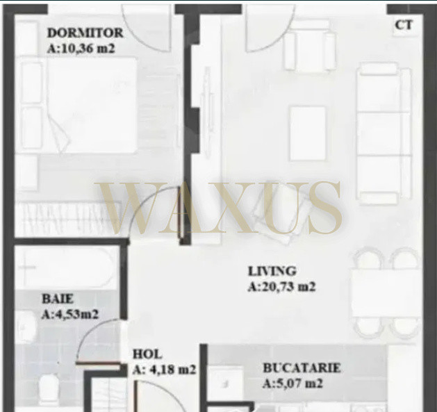 1 hol de intrare, 1 living+bucatarie open-space, 1 dormitor luminos, 1 baie cocheta si 1 balcon de 9MP.