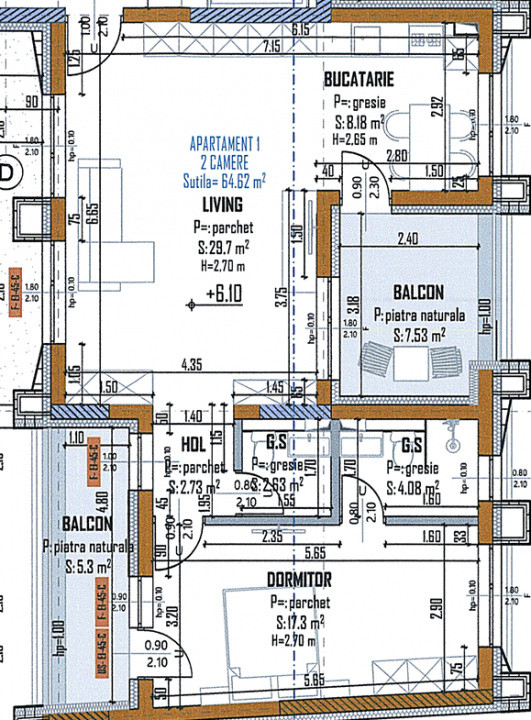 hol, living cu bucătărie open-space, dormitor, 2 băi și 2 balcoane.