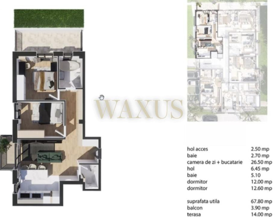 Apartamentul dispune de o suprafață utilă de 67,8mp, la care se adaugă un balcon de 3,9mp si 1 terasa de 14mp.