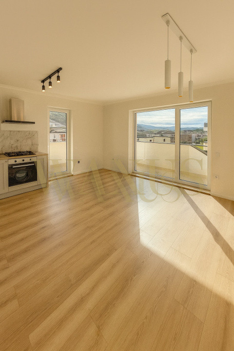 1 hol generos la intrare, 1 living cu bucatarie open-space, 2 dormitoare, 1 baie si 1 terasa circulara de 28mp.