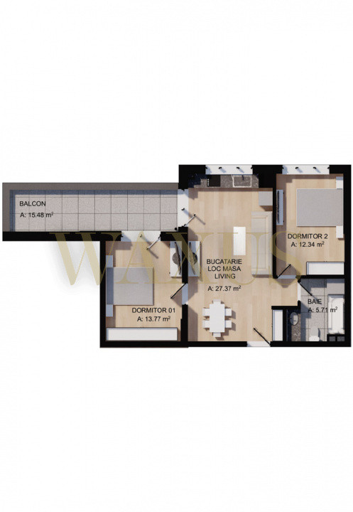 1 hol generos la intrare, 1 Living+Bucatarie open-space, 2 dormitoare luminoase, 1 baie cocheta si 1 terasa de 15.48mp.