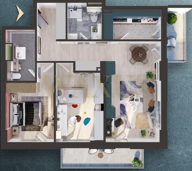 1 hol cu spatiu de depozitare, 1 living cu bucatarie open-space, 1 baie, 1 dormitor luminos, 1 dormitor matrimonial cu baie proprie si 2 balcoane respectiv de 4,72mp si 6,82mp.