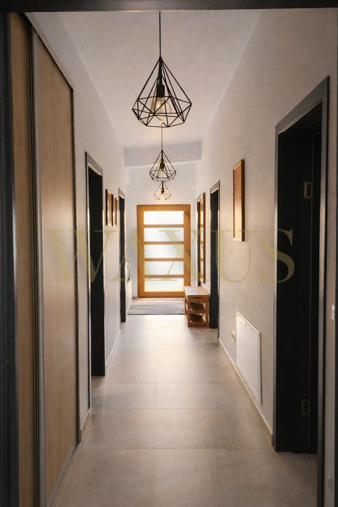1 hol generos la intrare, 1 bucatarie decomandata, 1 living generos cu iesire spre terasa, 3 dormitoare si 2 bai.