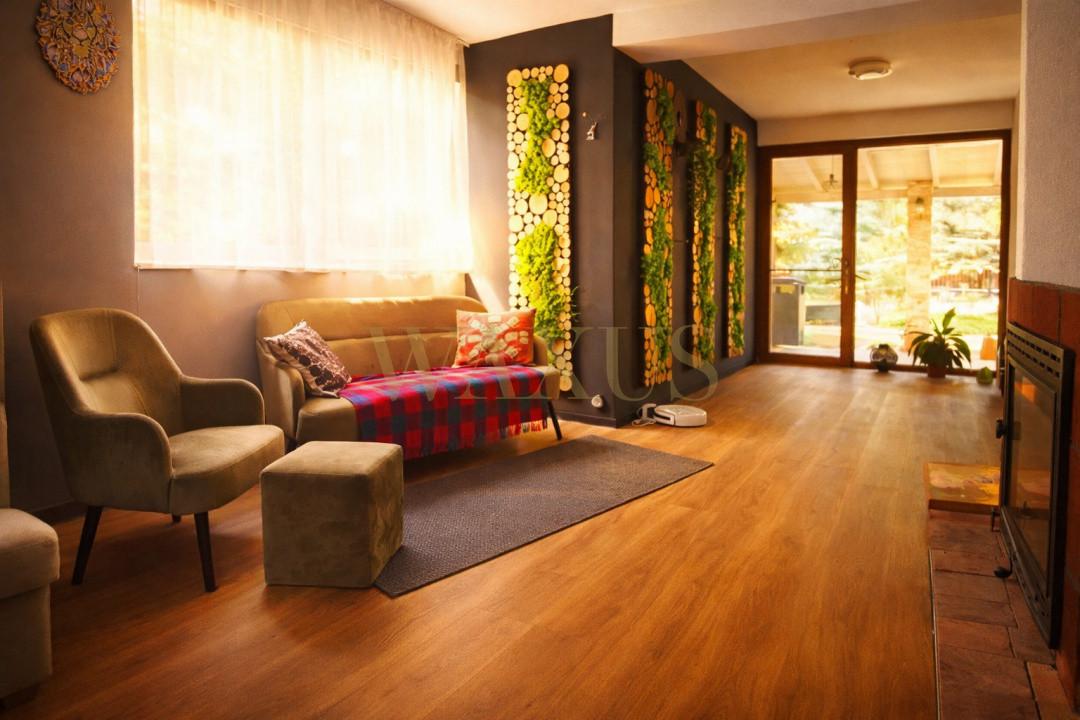 - Parter compus din: 1 hol generos la intrare, 1 Bucatarie separata complet echipata cu zona luat masa, 1 Living mare cu semineu central si iesire pe terasa, 1 Baie cu cada, 1 debara.