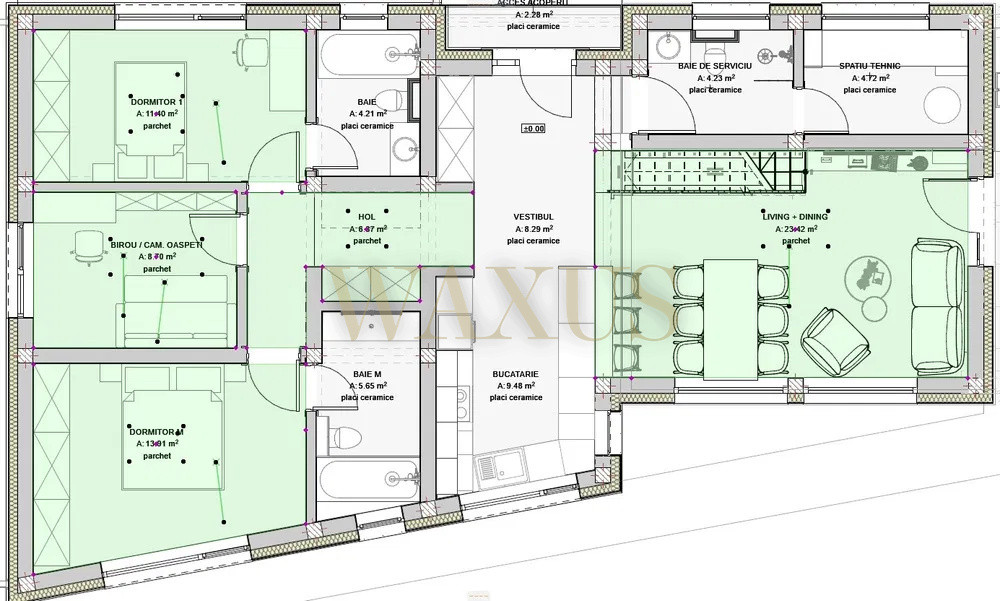 Compartimentare: Living + bucătărie open-space, Hol, 3 dormitoare, 3 băi, Terasă