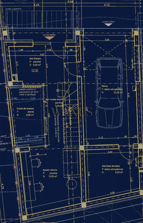 La subsol se regăsesc garajul, spațiul tehnic, o cameră și o terasă interioară.