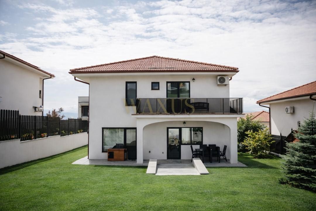 Casa beneficiază de lumină naturală din plin și este dotată cu centrală termică proprie, aer condiționat, sistem de supraveghere video, video interfon și poartă auto culisantă. În plus, dispune de sistem de irigație subteran pe mai multe zone.