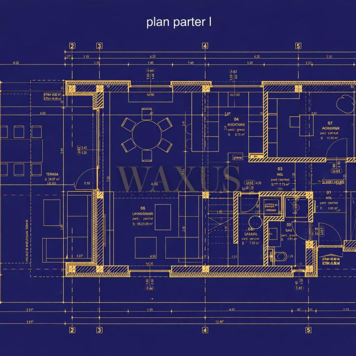 La parter se regăsesc livingul cu bucătărie open-space, birou, baie, cameră tehnică și terasă acoperită tip lounge.