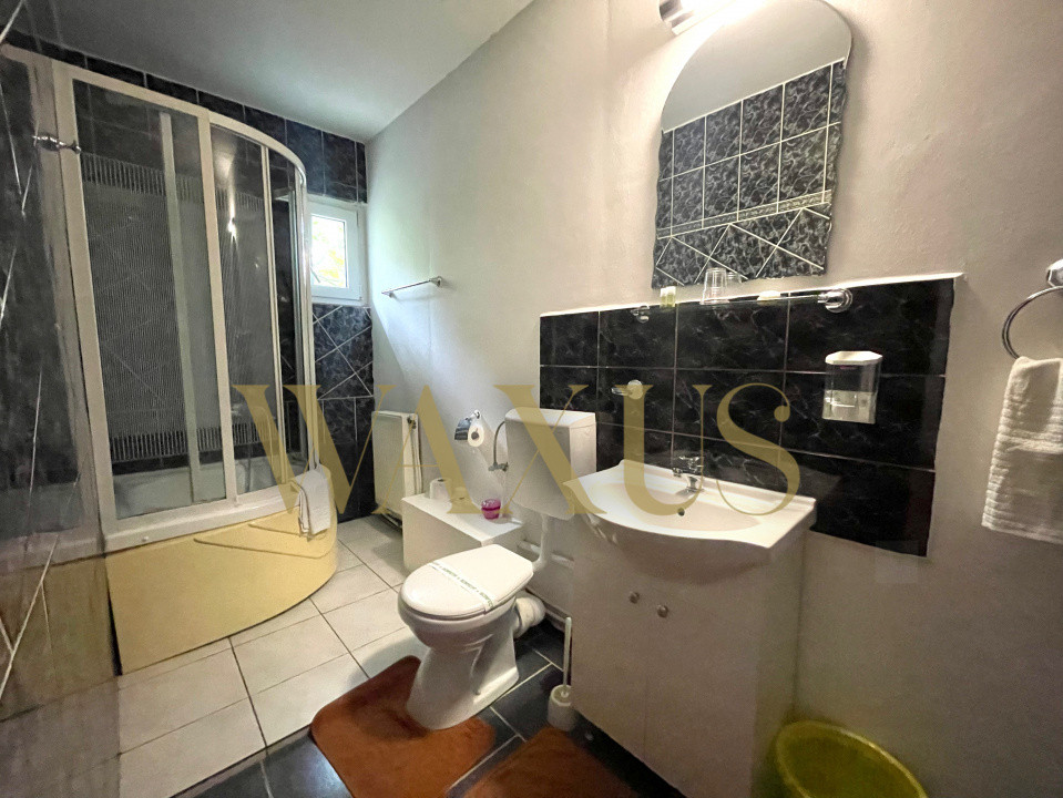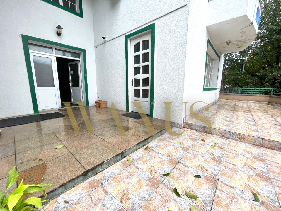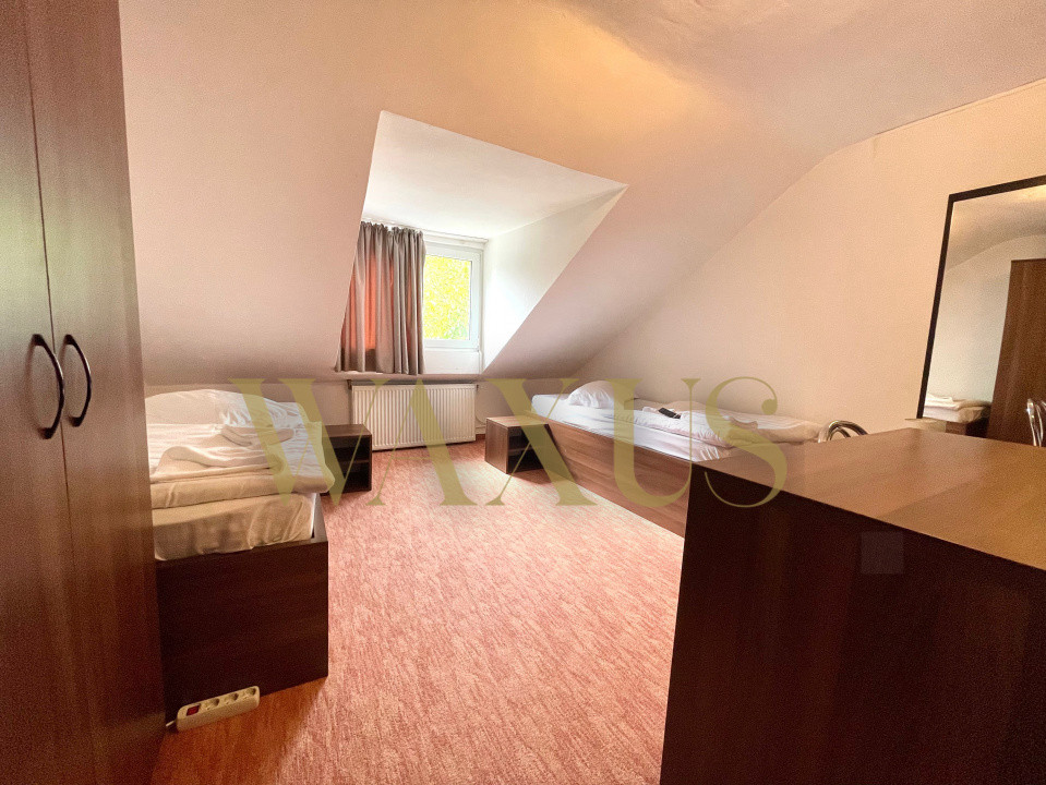 Parter: Recepție / lobby, bar, sală de servire cu șemineu, 2 dormitoare, 4 băi, terasă, curte spațioasă amenajată;